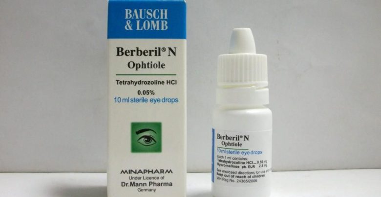 قطرة بيربيريل ن لعلاج تهيج العين والتهاب الاذن Berberil N والدواء يحتوي على المادة الفعالة Tetrahydrozoline والتى تستعمل فى العلاج والوقاية من التهاب العين والاذن.